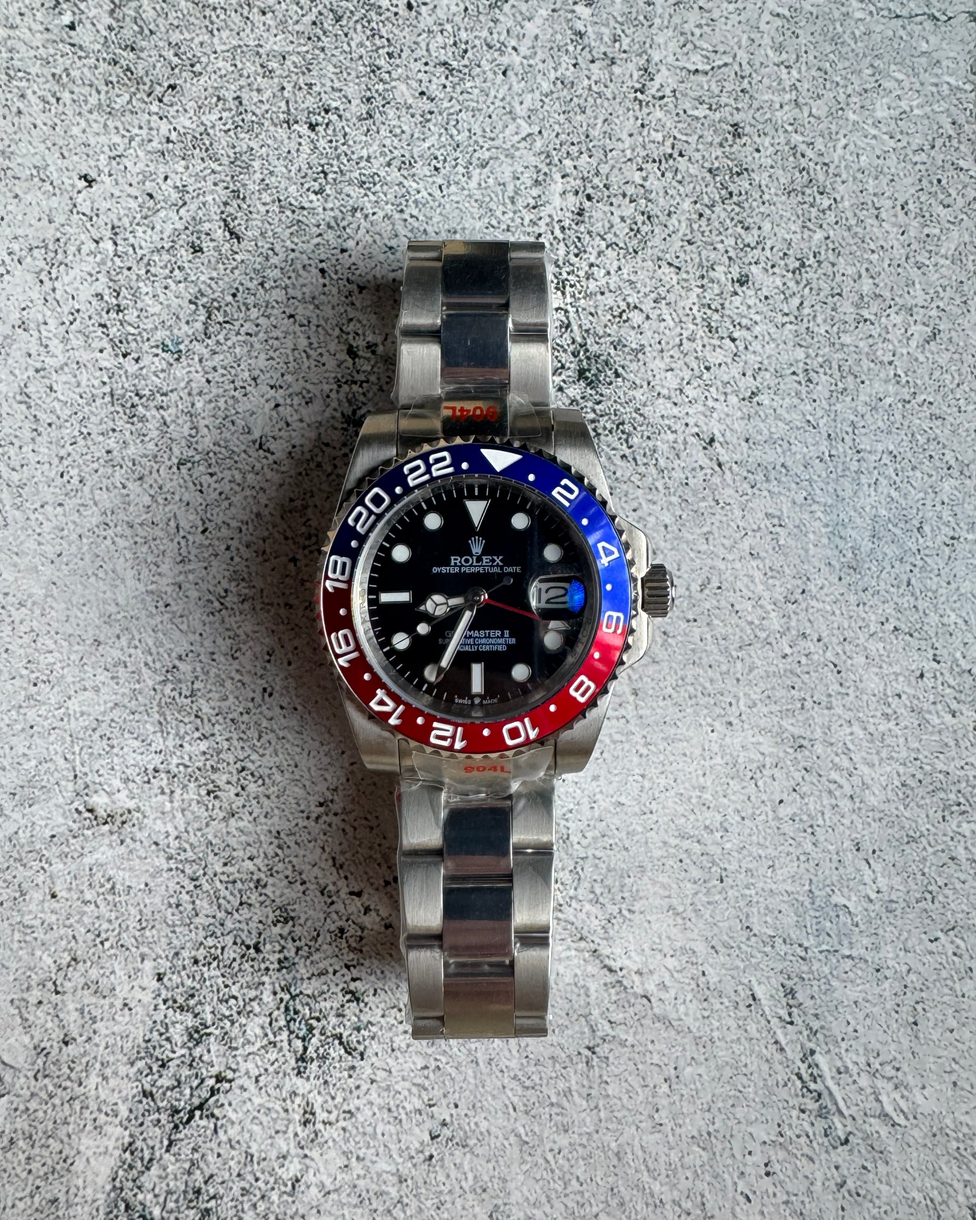 Dial: Black with luminous hour markers, Mercedes hands, red GMT hand