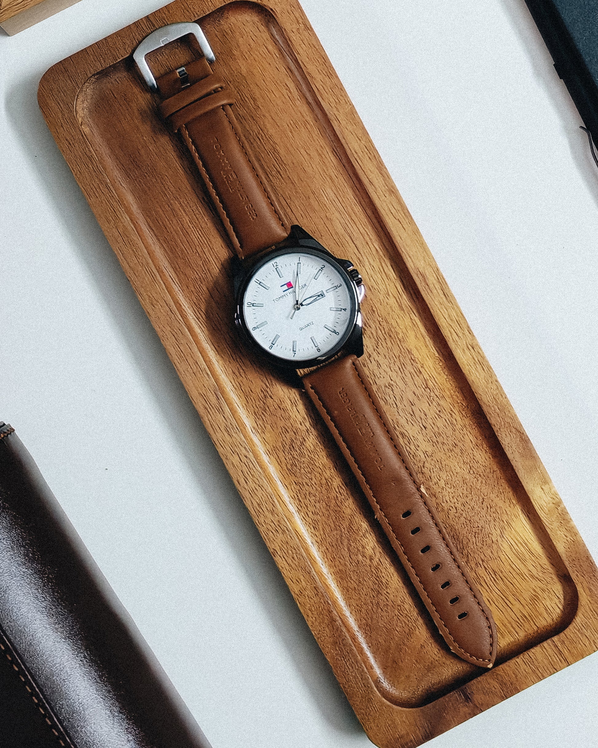 الساعة تومي جلد طبيعي ضد تغيير اللون السعر شامل الشحن والعلبة الأصلية والشنطة الفاخرة.