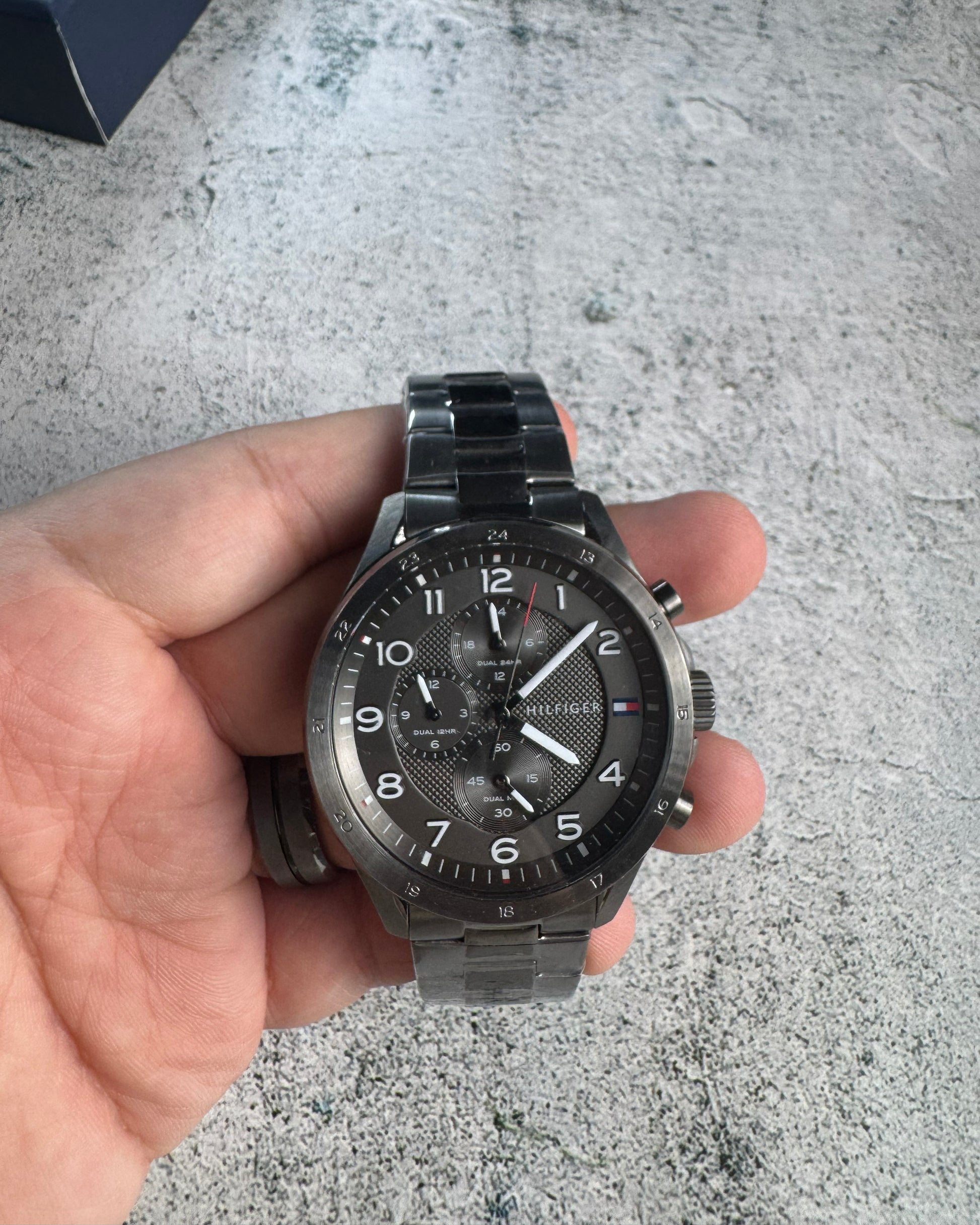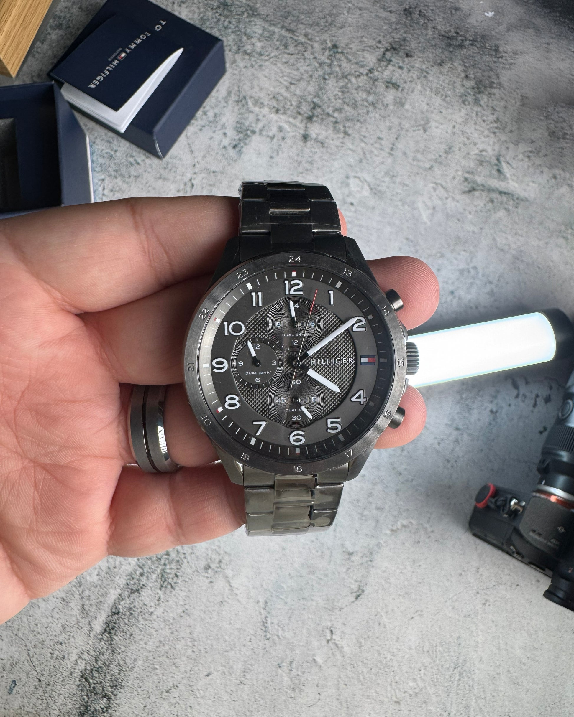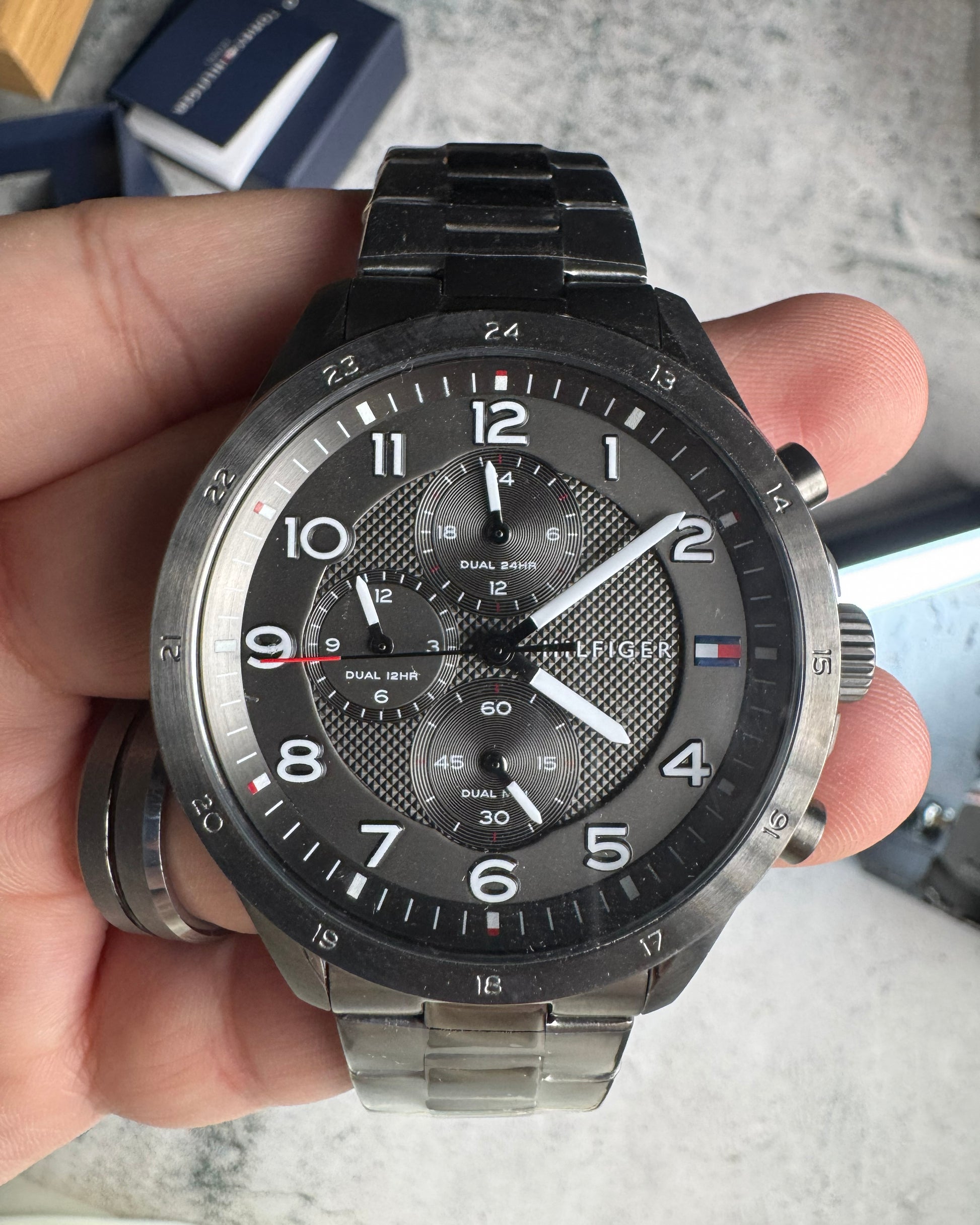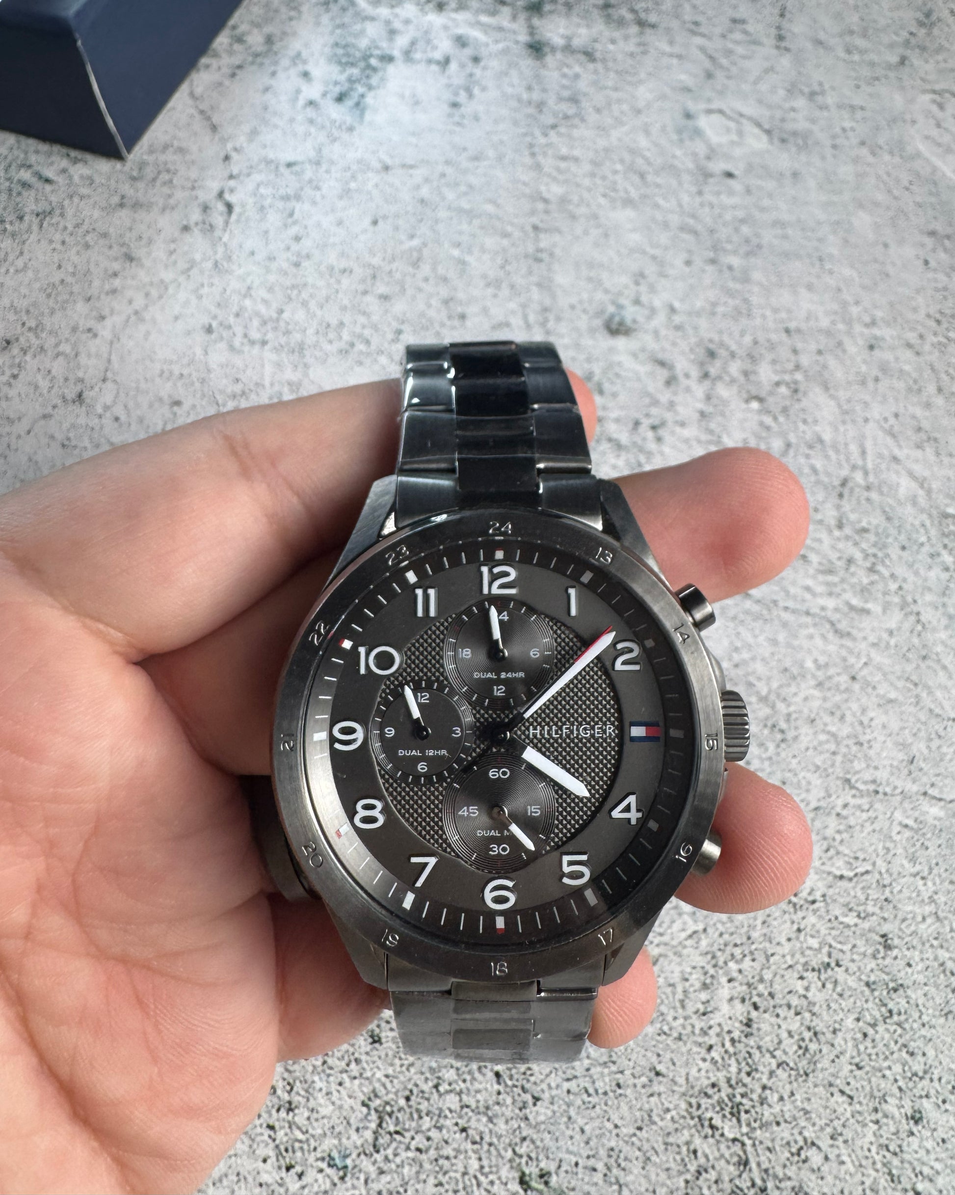 Sleek and modern Tommy Hilfiger timepiece featuring a black dial with subtle black/smoke markers and the iconic Tommy flag logo. The black-plated stainless steel case and bracelet provide a refined and contemporary look, while the Japanese quartz movement ensures accurate timekeeping. Includes a date display at 6 o’clock and offers water resistance suitable for daily wear.
