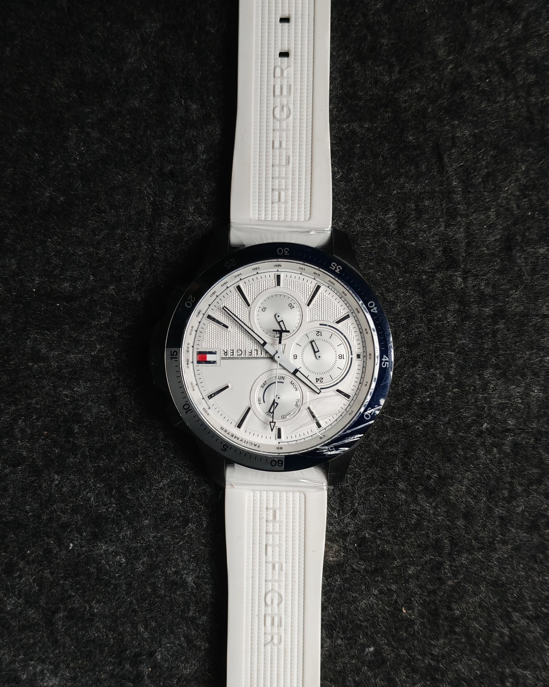 Stylish Tommy Hilfiger timepiece featuring rubber strap for comfort and modern appeal. The multi-function chronograph dial ensures precise timekeeping with sleek sub-dials, all housed in a durable stainless steel case. Water-resistant design provides reliable performance for daily wear, combining practicality with style.