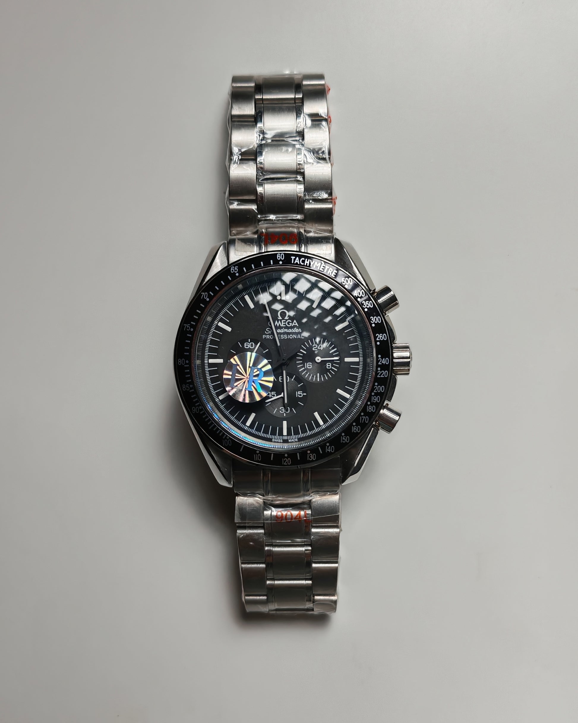 Master Quality edition of the legendary Omega Speedmaster. Features a sleek black chronograph dial, solid stainless-steel case, and a mix of brushed & polished finishing for a refined look. The automatic Russian movement ensures smooth and reliable timekeeping.